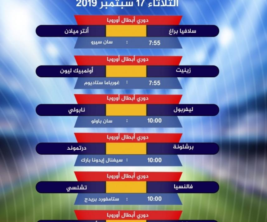 06 سبتمبر 2017 , 06:29 دورى ابطال اوروبا. بتوقيت القاهرة بتوقيت الرياض بتوقيت غرينتش بتوقيت المغرب بتوقيت بيروت بتوقيت الجزائر بتوقيت الكويت بتوقيت تونس.